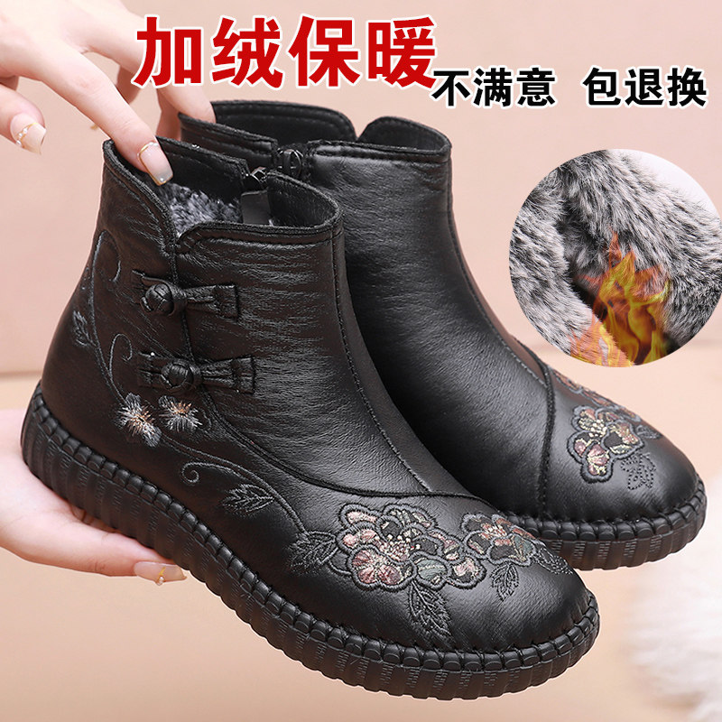 妈妈鞋冬季棉鞋中年女鞋雪地靴加绒保暖中老年人防滑短靴软底皮鞋