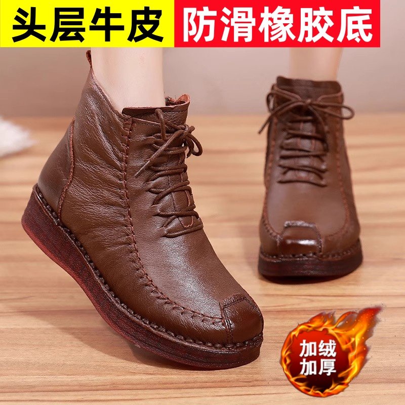 冬季真皮牛筋底妈妈短靴女鞋加绒保暖平底中老年女士皮鞋防滑软底