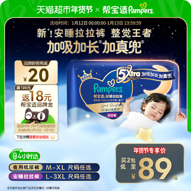 【整觉王者】帮宝适安睡拉拉裤透气L-3XL尿不湿尿裤迷你试用4包装