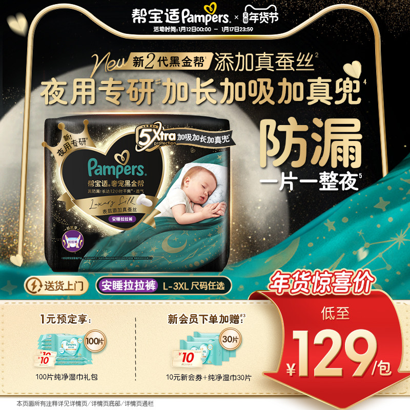 【夜用专研】帮宝适黑金帮安睡拉拉裤添加真蚕丝L-3XL尿不湿尿裤