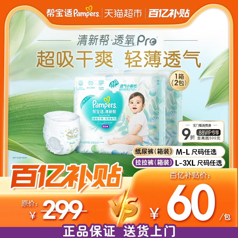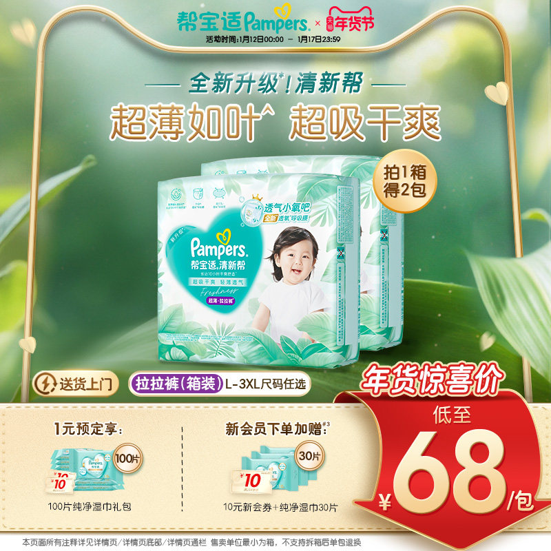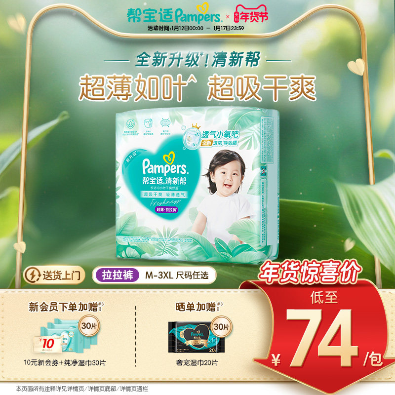 【百亿补贴】帮宝适清新帮纸尿裤拉拉裤大包装透气轻薄M-3XL