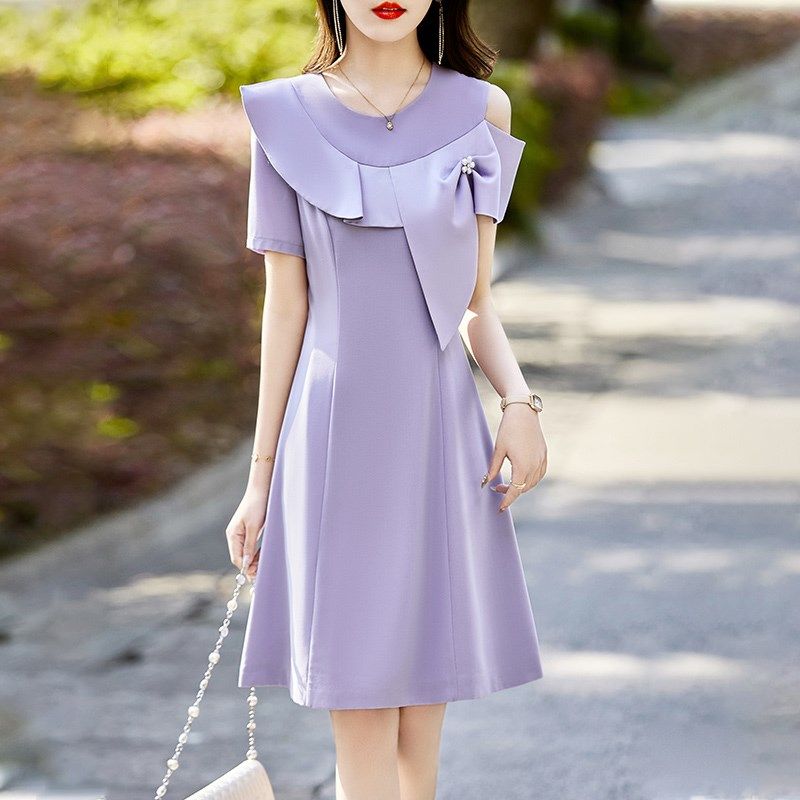 法式小个子连衣裙女大码2024夏季高级感荷叶边露肩气质名媛小礼服