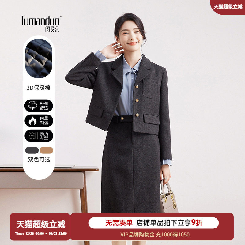 幂典西装套装女秋冬加棉厚黑色正装大学生通勤高级小个子西服外套
