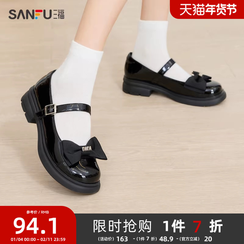 三福休闲鞋女春季淑女甜美蝴蝶结圆头厚底玛丽珍鞋女鞋833416