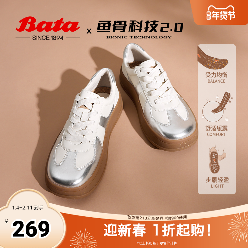 Bata休闲鞋女春秋新款牛皮鱼骨百搭拼色厚底板鞋AGU23CM4