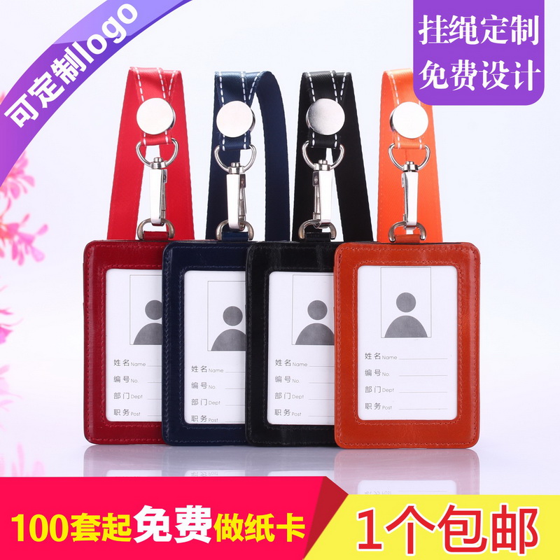 顶天可定制压印logo烫金银皮卡套配金属挂绳员工厂牌胸牌胸卡皮质工作证带电信钩工卡牛皮证件卡套公司员工牌