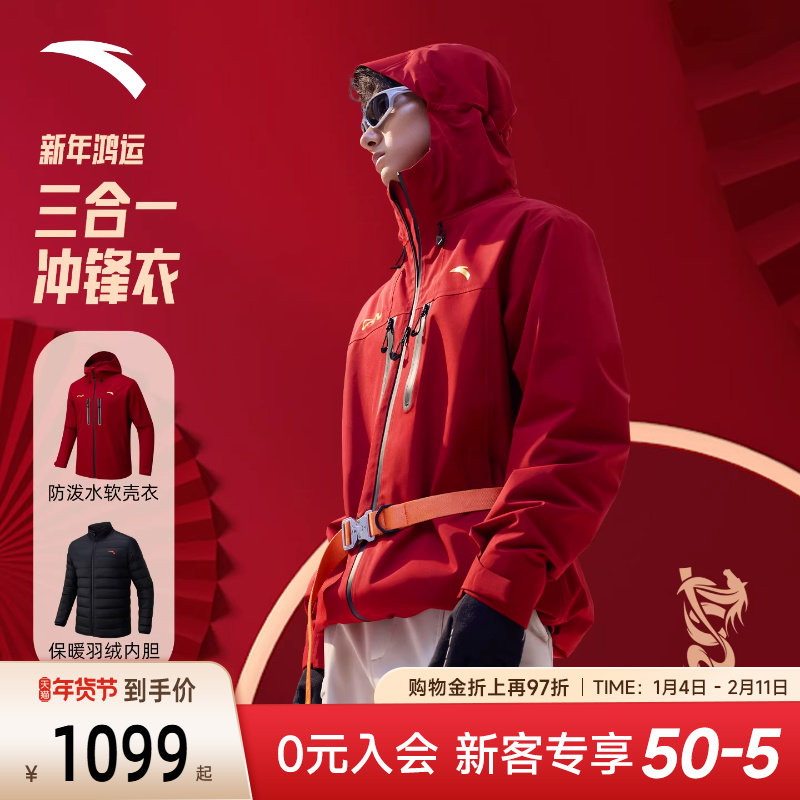 安踏CHN中国外套男款新年红色三合一冲锋衣羽绒服内胆户外运动服