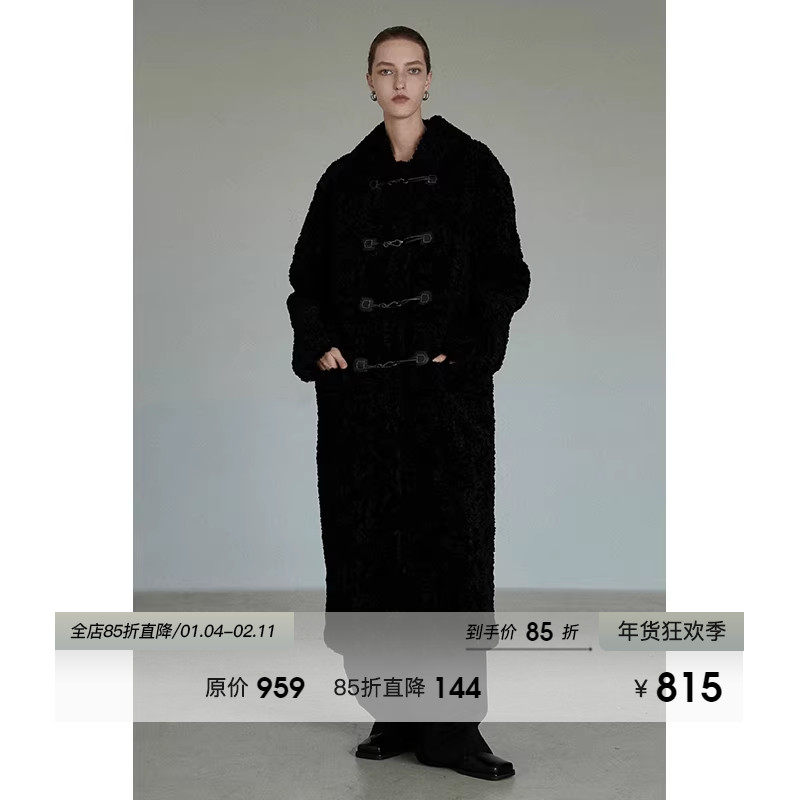 UNSPOKEN黑色牛角扣大衣女仿安卡拉卷毛绒加厚长款外套高级感冬装