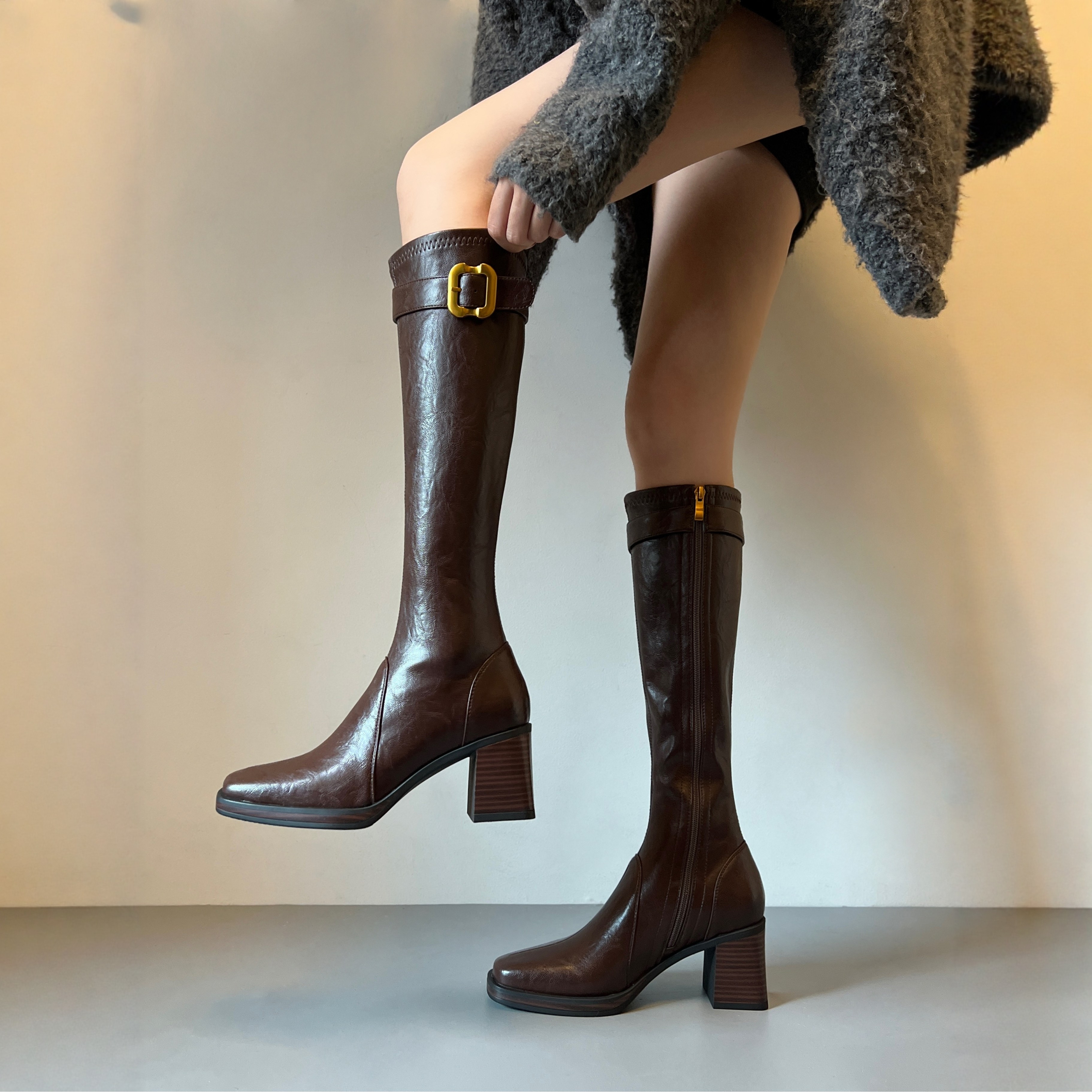 高跟长筒靴女加绒保暖2025年冬季皮带扣方头包腿瘦腿长靴子骑士靴