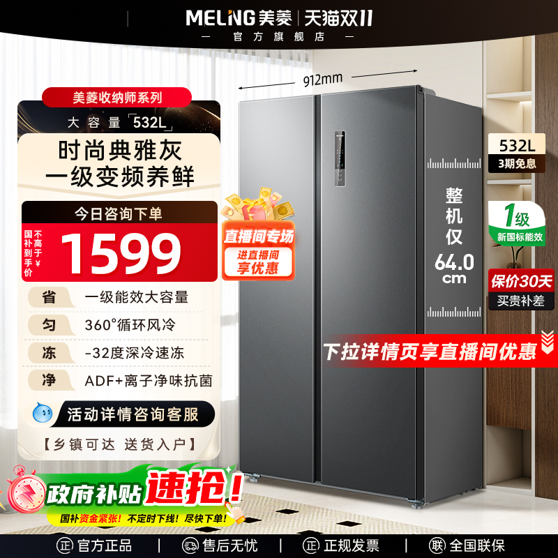 美菱收纳师532升一级能效超薄健康养鲜对开门冰箱政府补贴332
