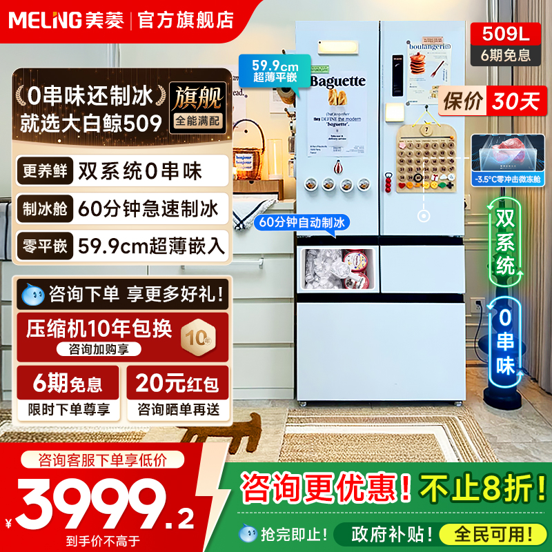 美菱大白鲸509L超薄嵌入法式双系统制冰机冰箱家用以旧换新补贴