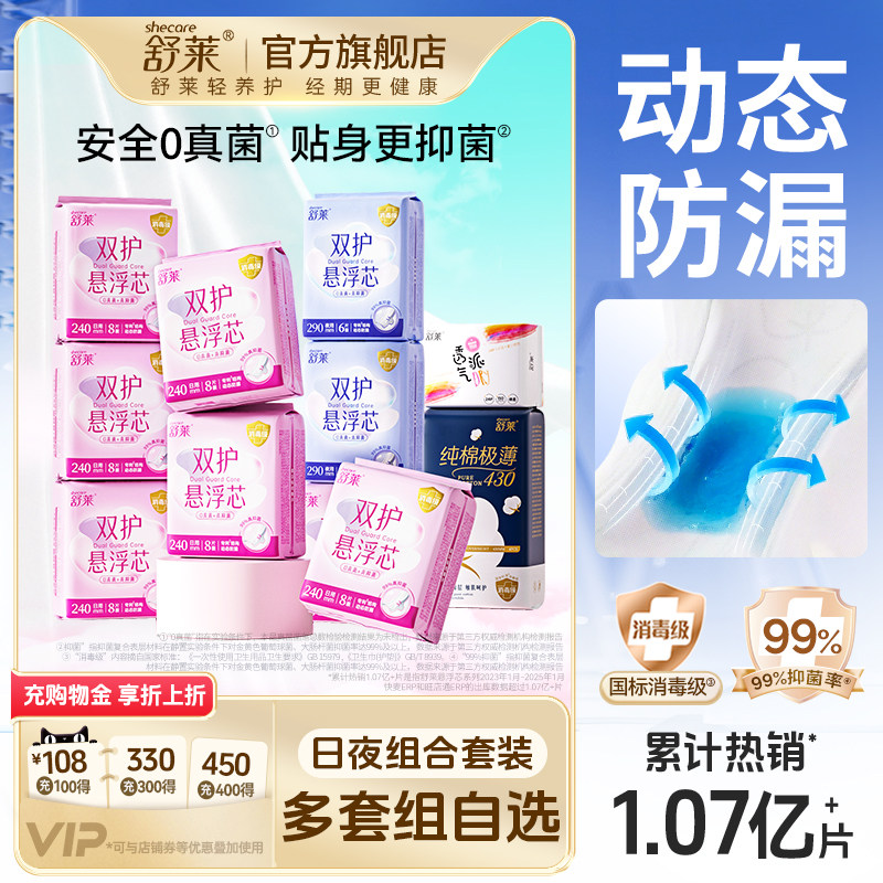 【爆款自选】舒莱悬浮芯卫生巾消毒级0真菌防漏透气日夜用组合装