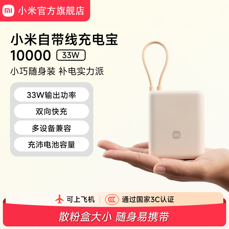 【3C认证】小米自带线充电宝10000 33W双向快充小巧超薄迷你超大容量移动电源适用于华为小米苹果15可上飞机