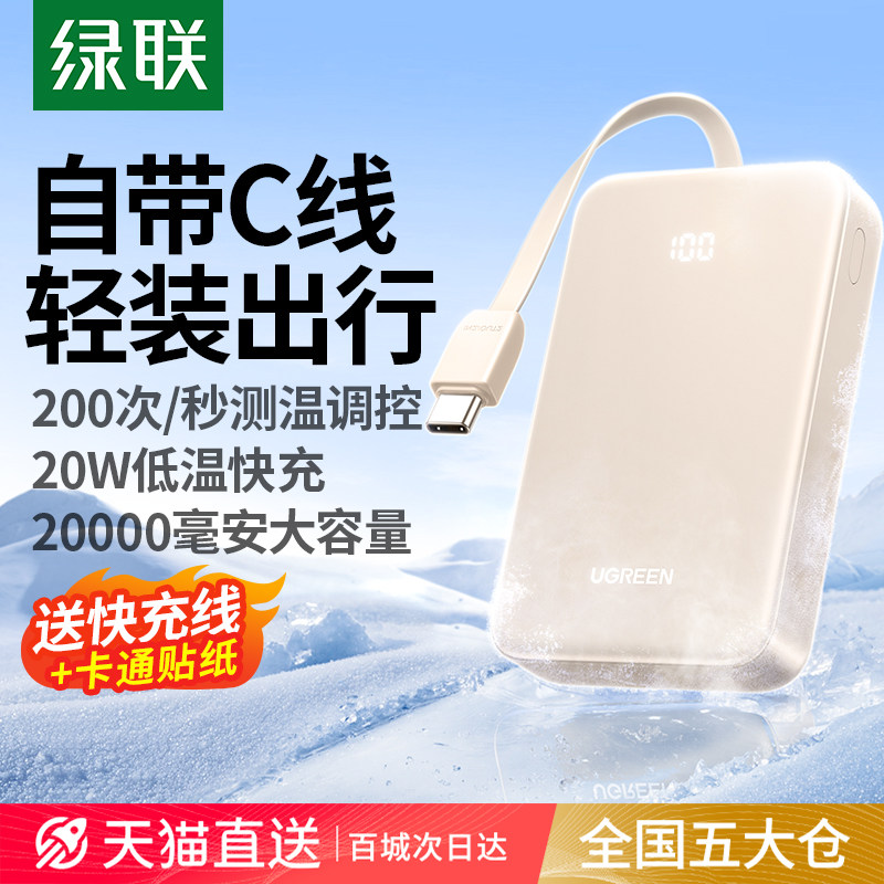 【充电宝3C认证可上飞机】绿联2026新款充电宝20000毫安自带快充C线适用苹果17小米大容量移动电源官方旗舰店