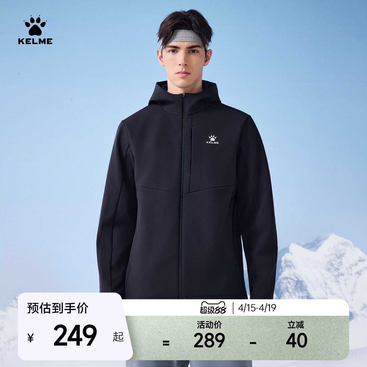 KELME卡尔美软壳衣男冬加绒梭织运动外套防泼水连帽户外夹克冲锋
