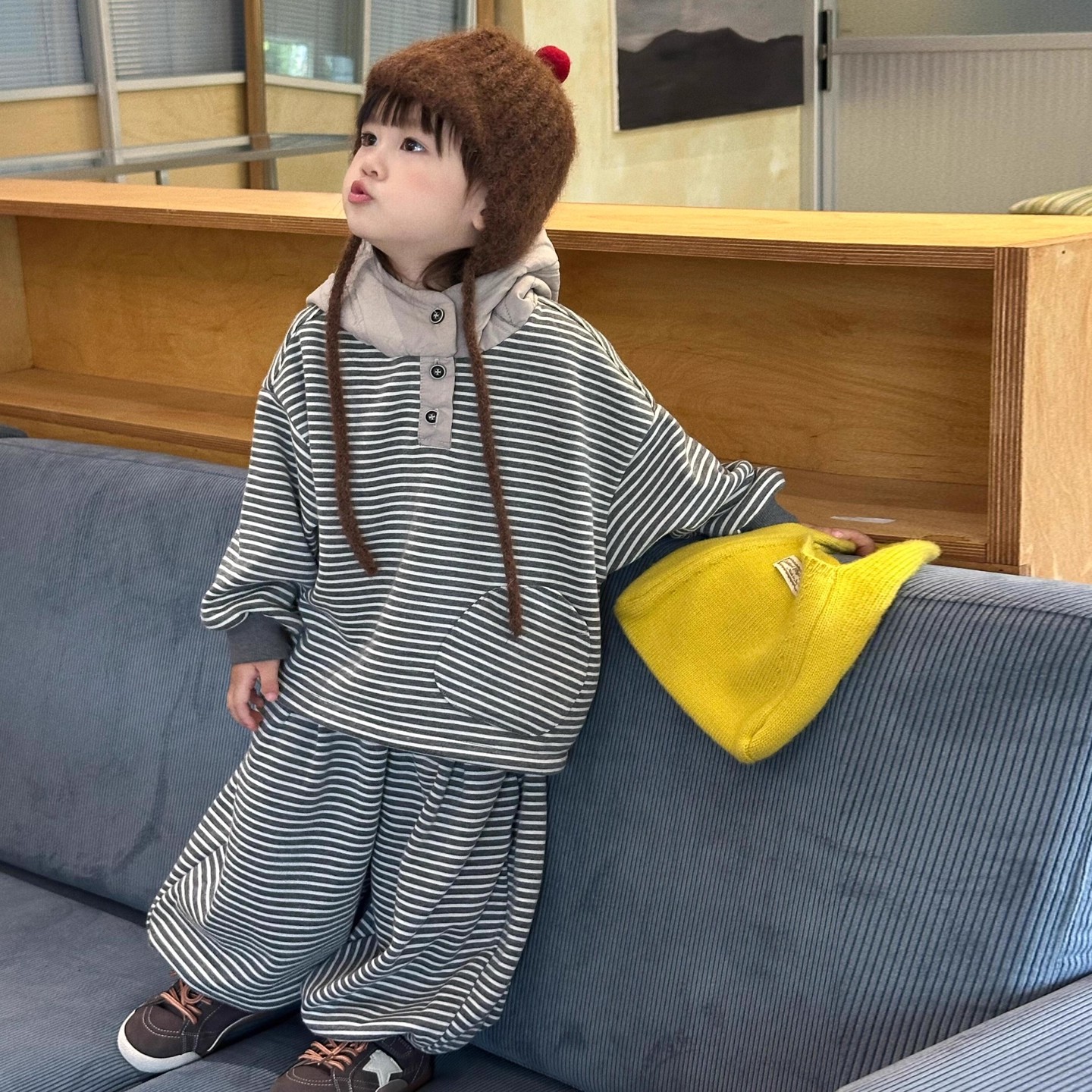 巴拉妮琪小黄鸭儿童新年套装卫衣带帽加绒男女童冬季过年服两件套