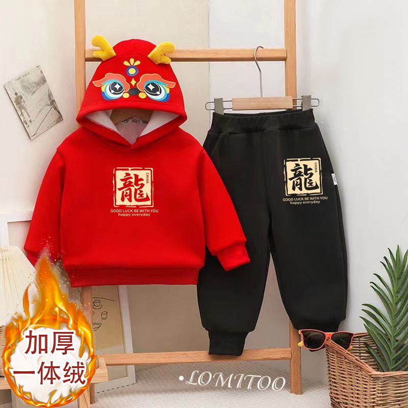巴拉妮琪儿童新年套装卫衣带帽龙年加绒男童冬季女童过年服两件套