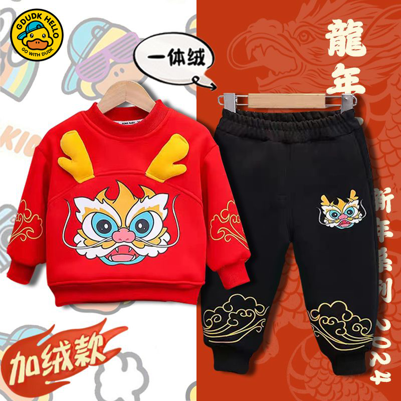 小黄鸭童装男童冬季女童过年两件套儿童新年套装卫衣带帽龙年加绒