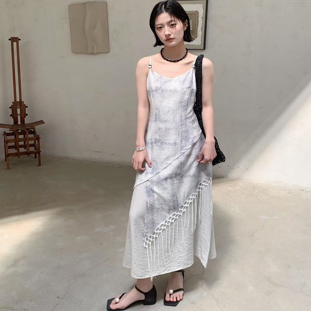韩版2025夏季新款新中式流苏设计感显瘦A字裙女长款吊带连衣裙女
