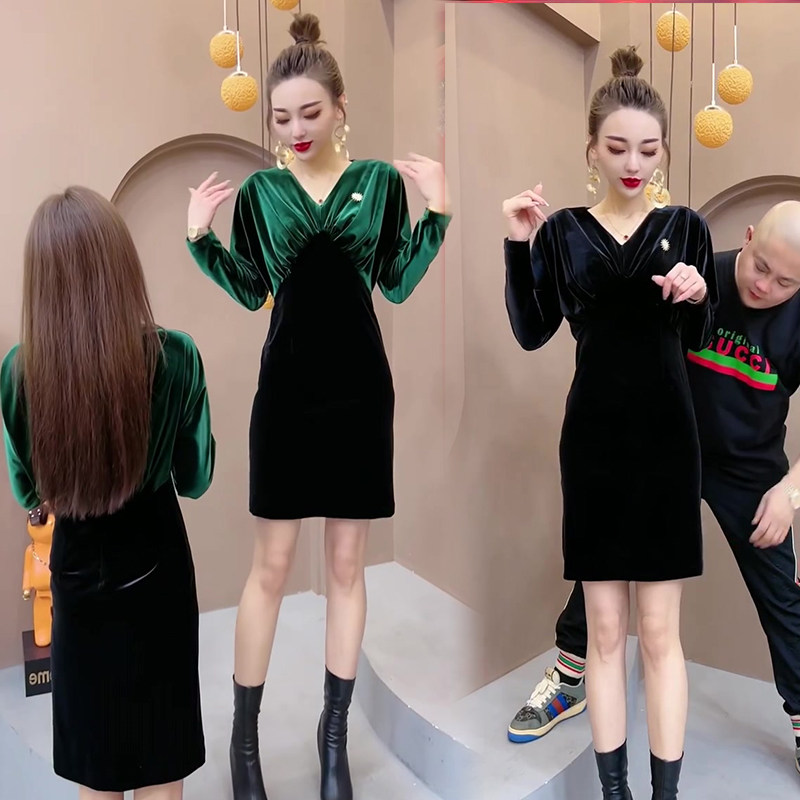网红爆款时尚金丝绒连衣裙女2022年冬季新款韩版显瘦长袖V领裙子