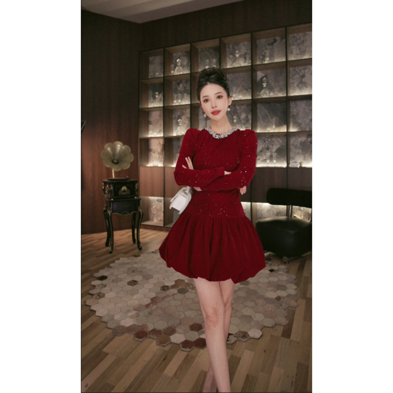 网红爆款金丝绒连衣裙女2023年秋季新款韩版显瘦长袖V领收腰裙子