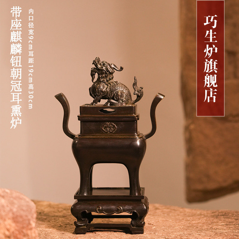 陈巧生香炉旗舰店带座麒麟钮朝冠耳熏炉仿古香炉铜器铜炉收藏送礼