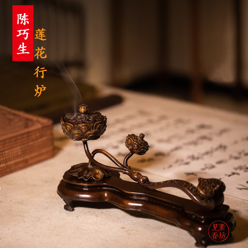 见素香坊 莲花行炉 陈巧生制带座鹊尾炉手持行香炉装饰摆件C388-7