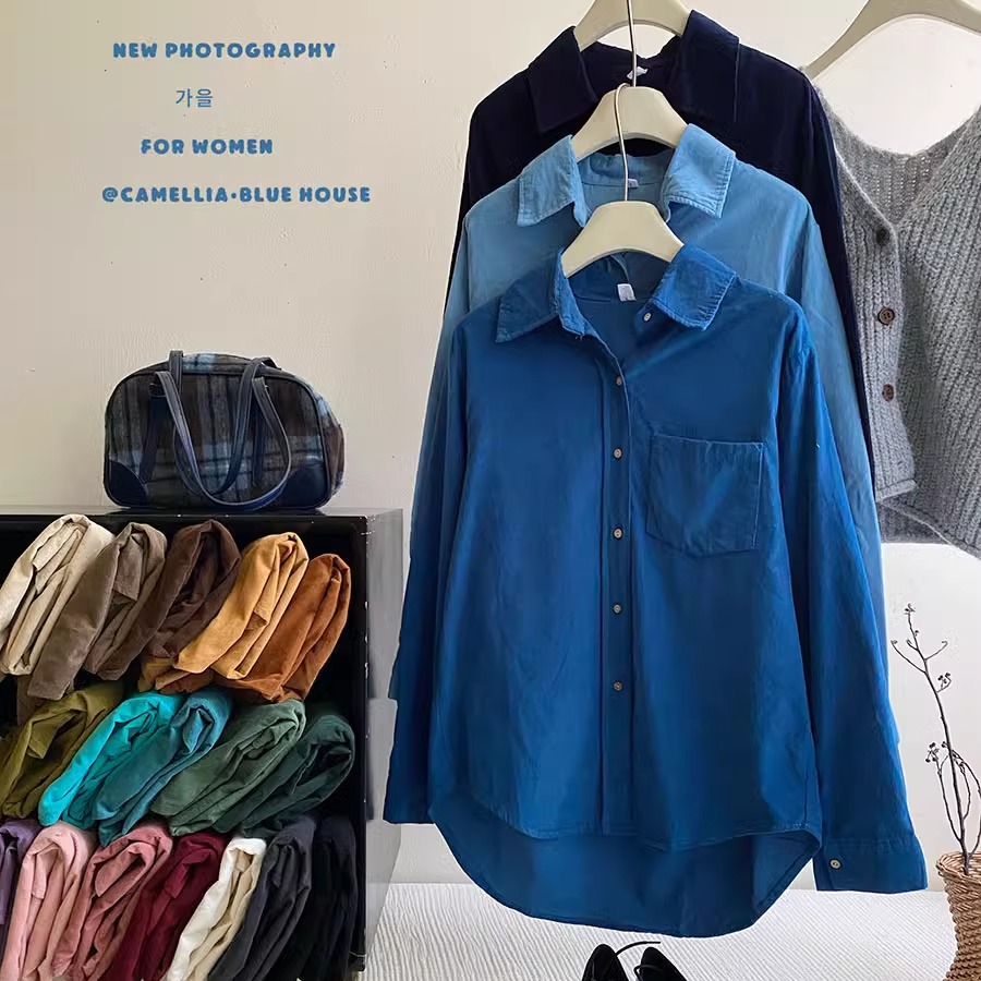 王炸蓝色长袖翻领灯芯绒衬衫女秋冬气质内搭宽松净版衬衣叠穿上衣
