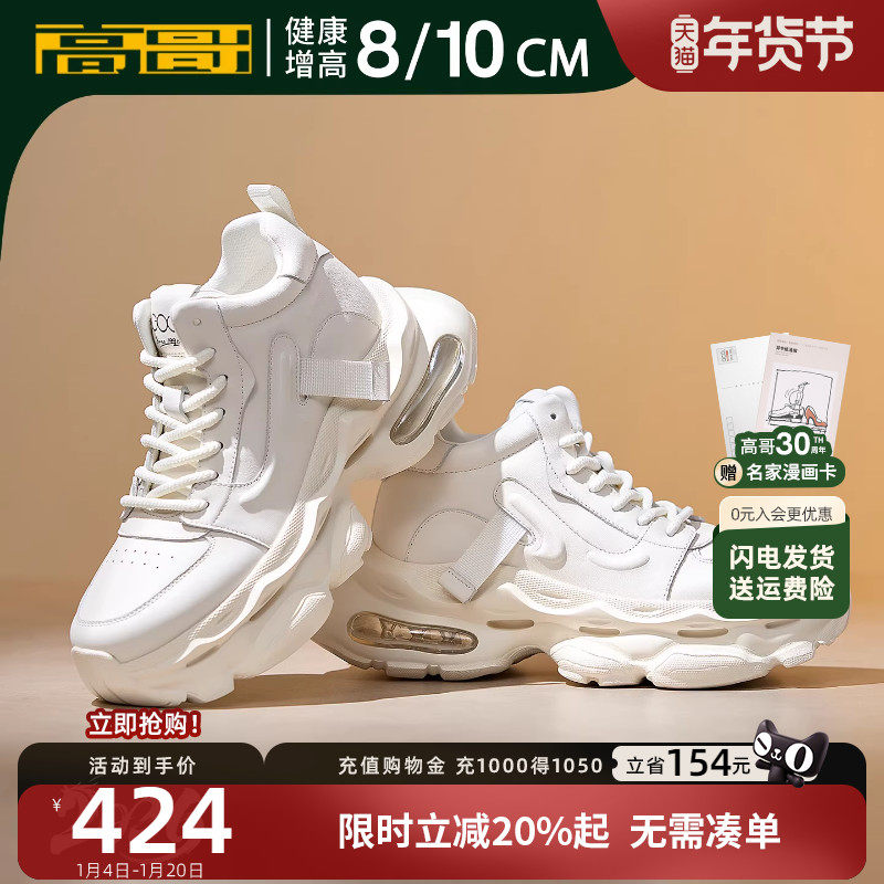 高哥增高鞋8cm新款休闲板鞋皮面运动男鞋轻便厚底内增高小白鞋男