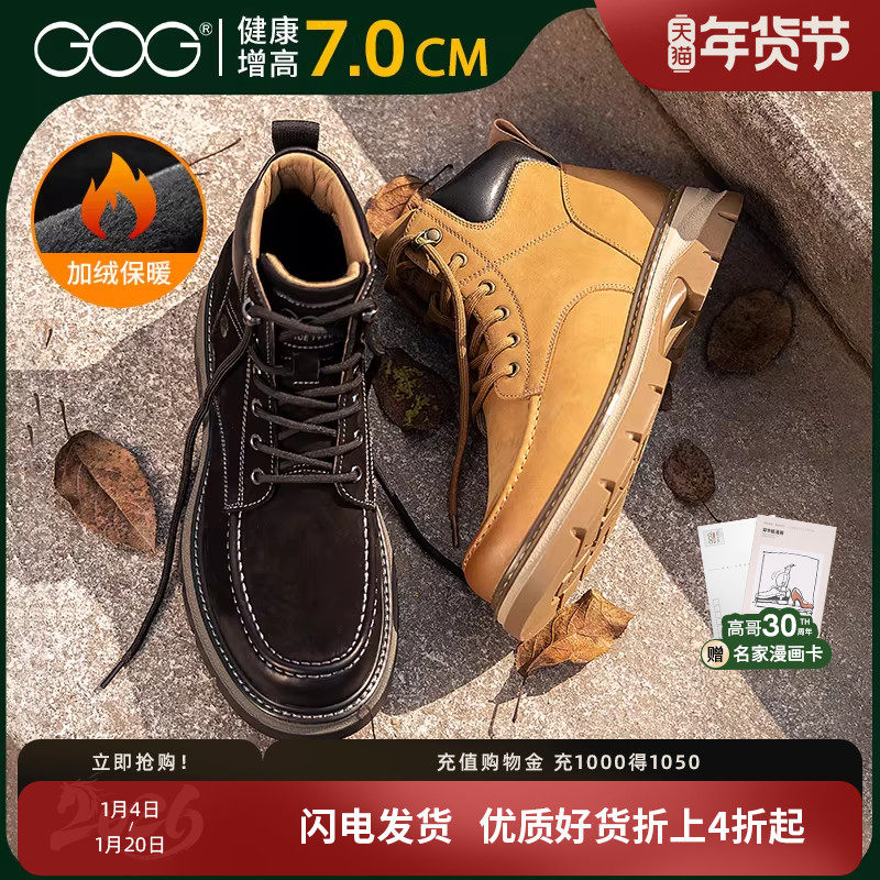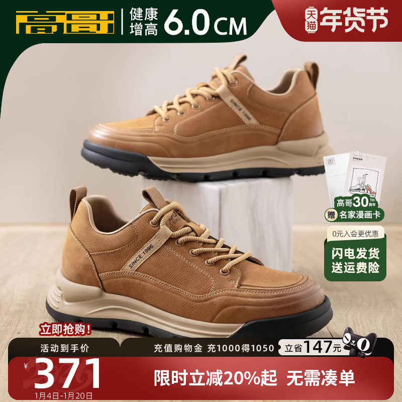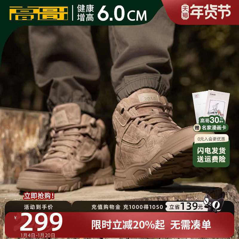 高哥增高工装鞋男款秋冬户外男鞋头层牛皮轻便厚底鞋内增高休闲鞋