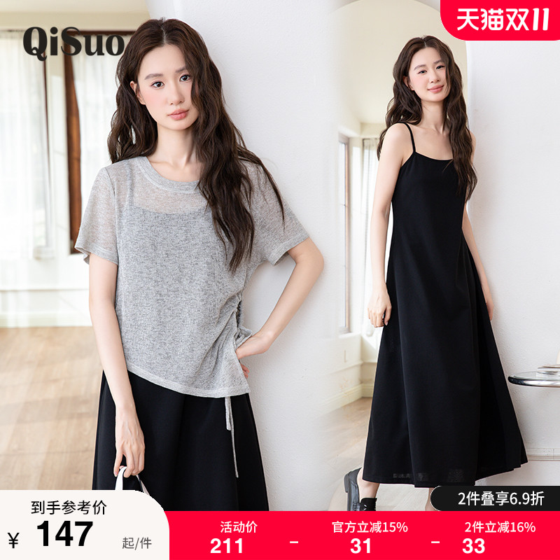 绮娑大码女装两件套装连衣裙显瘦胖MM吊带黑色长裙抽绳收腰薄罩衣
