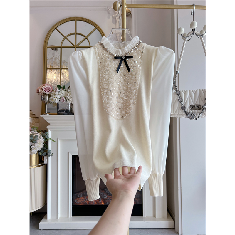 灯笼袖立领雪纺衫上衣女2025秋冬新款重工镶钻气质宽松套头针织衫