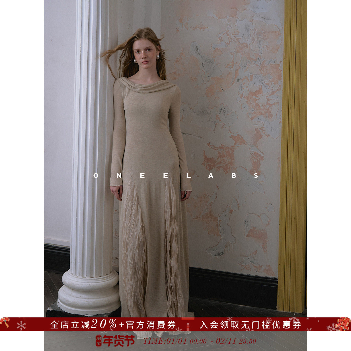 ONEELABS原创品牌 桑蚕丝/羊毛混纺 法式压褶插片飘带针织连衣裙