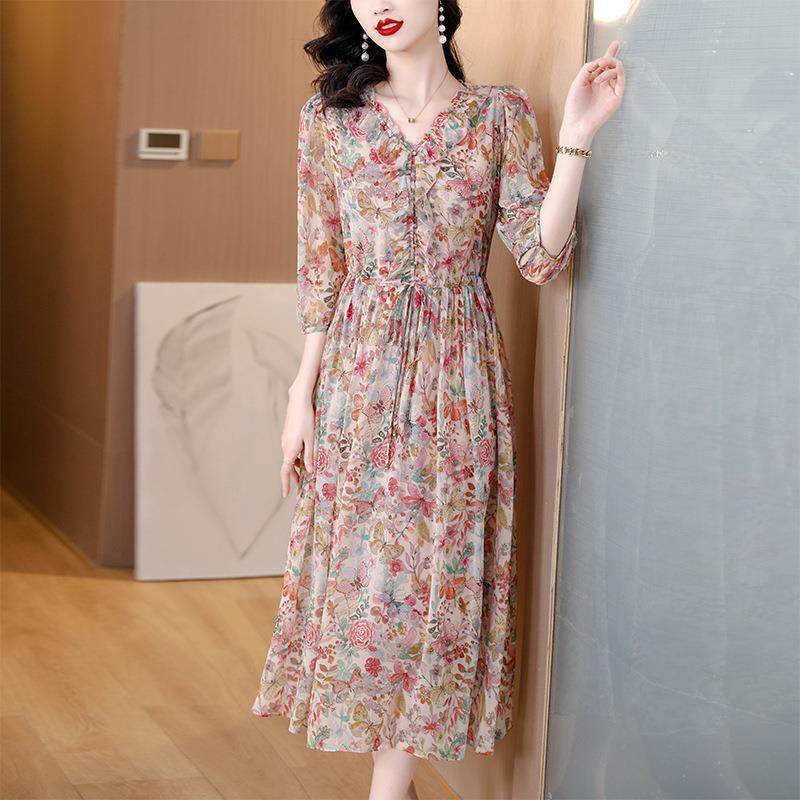 品牌桑蚕丝连衣裙女新款888999收洋腰显瘦中妈妈年字裙子领气裙