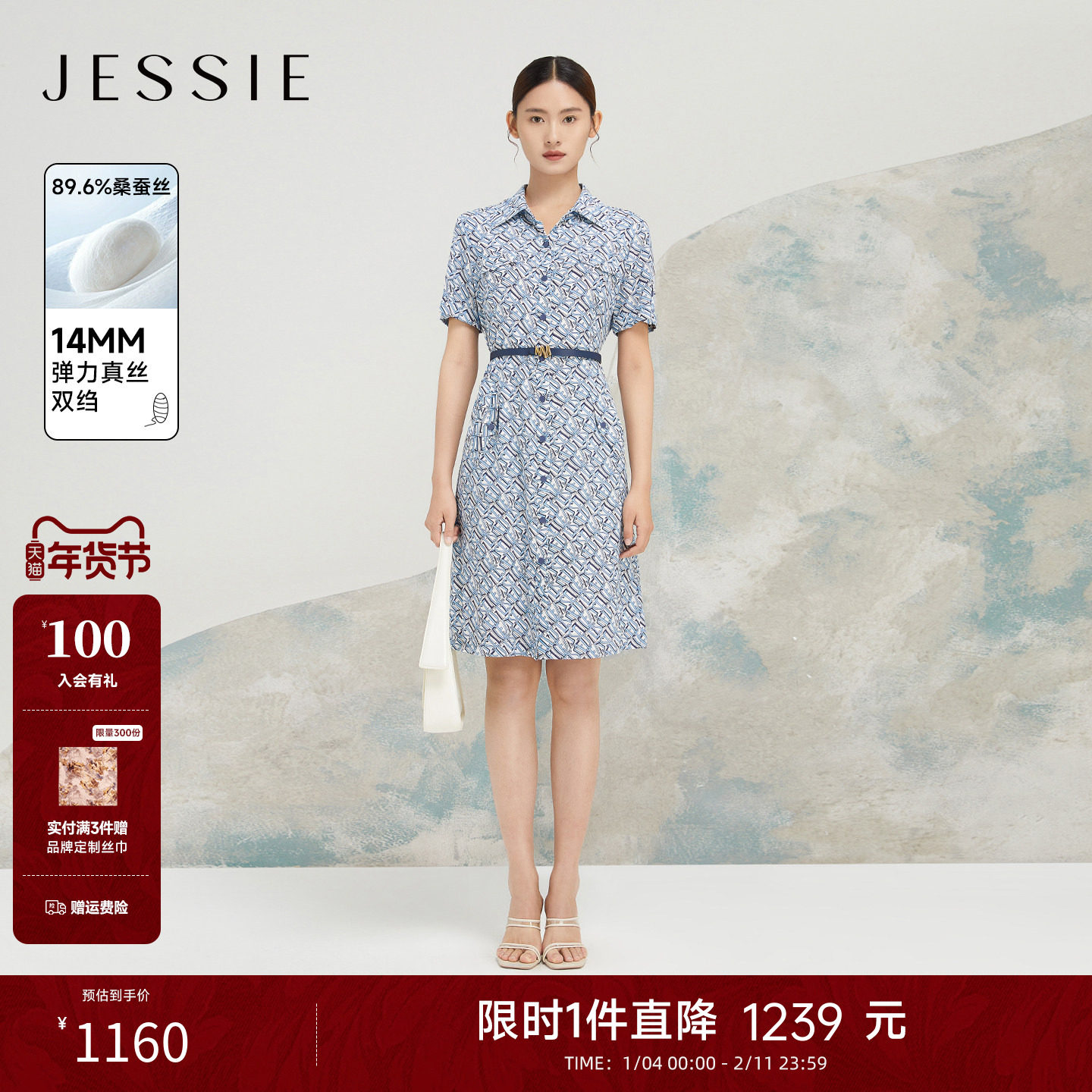 【商场同款】JESSIE品牌字母印花收腰显瘦桑蚕丝连衣裙女士夏新款