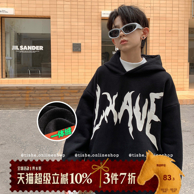 男童卫衣加绒秋冬加厚宽松中大童男装儿童连帽男大童青少年秋装潮