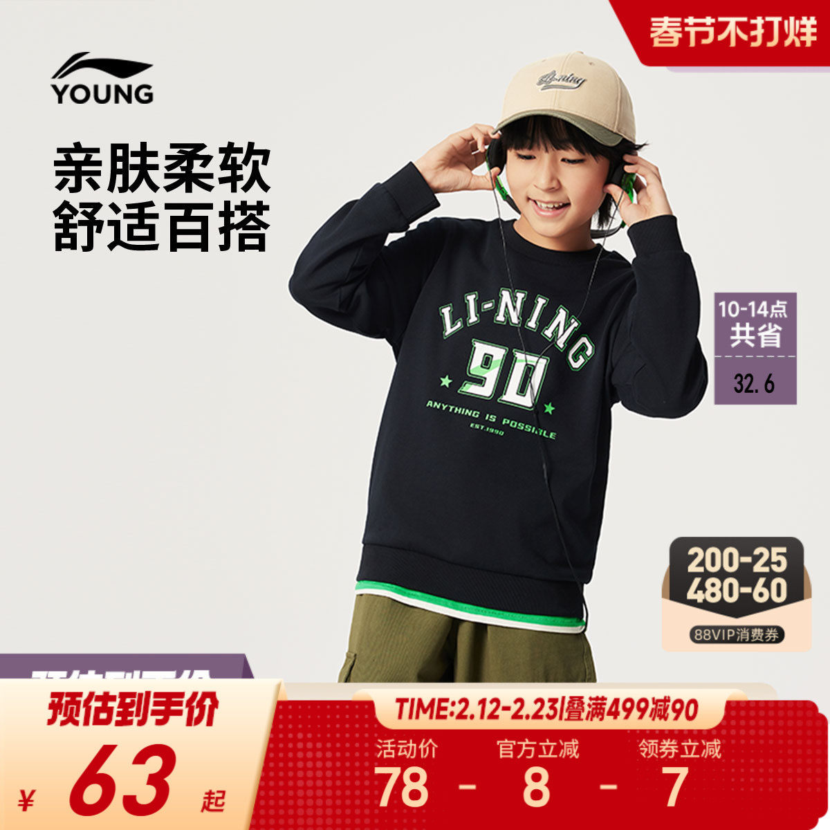 李宁男童卫衣官方旗舰正品青少年大童秋装儿童男孩加绒保暖款上衣