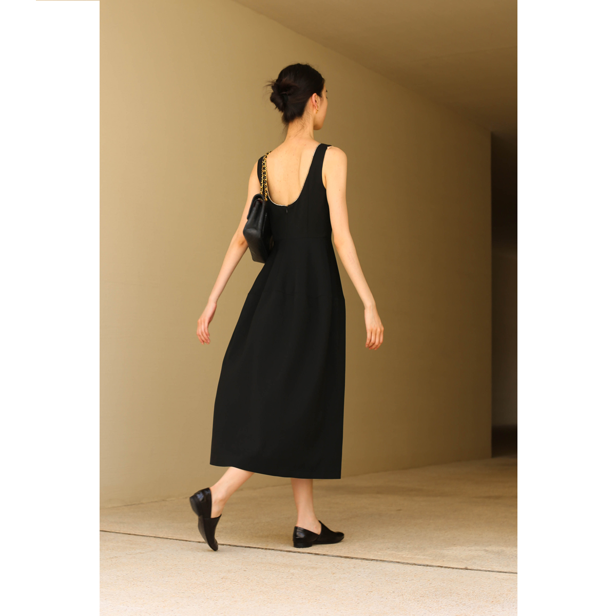 无有无印黑色醋酸露背无袖收腰中长款小黑裙礼服连衣裙24122