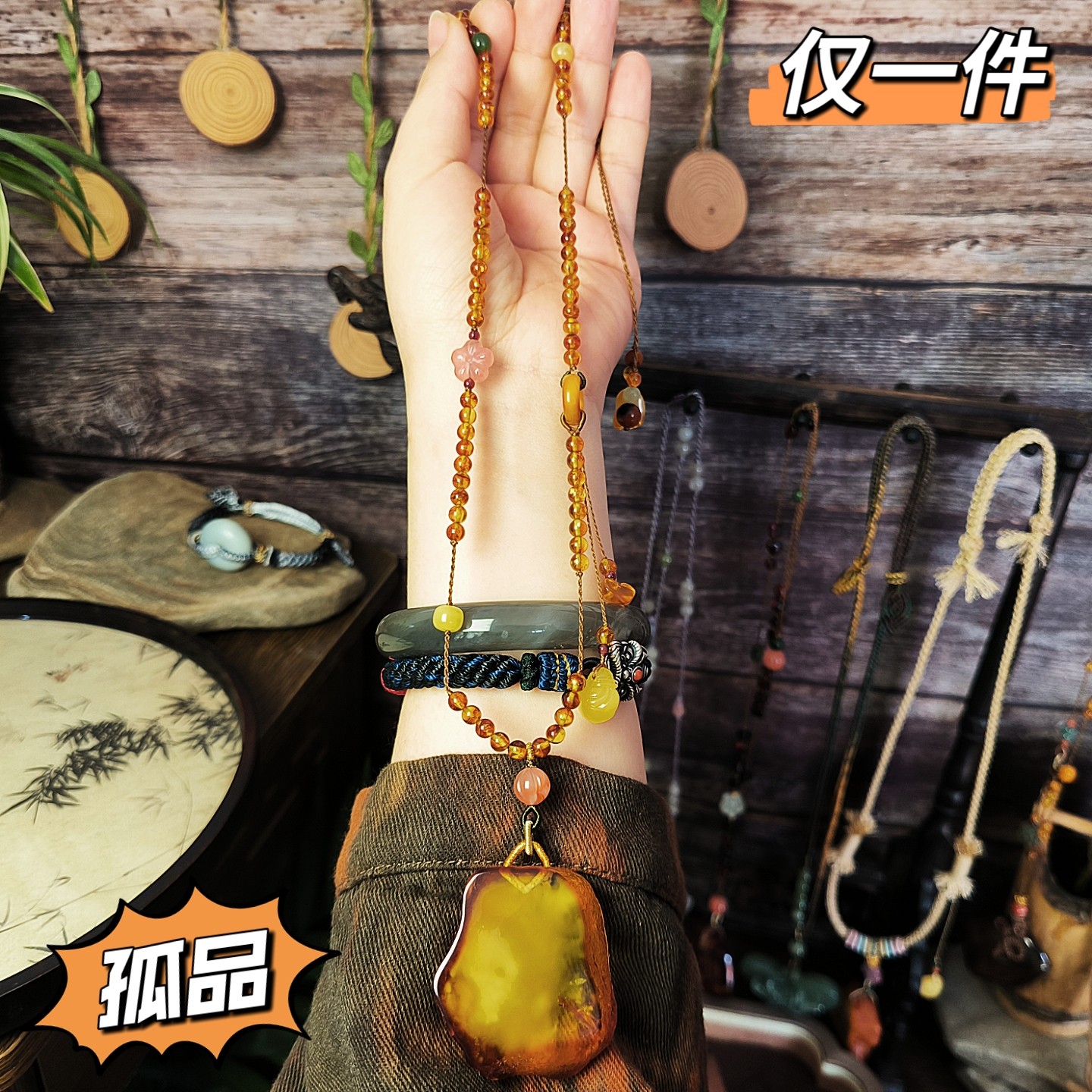 孤品一物一图原创设计天然琥珀蜜蜡吊坠手工编织毛衣链女款带证书