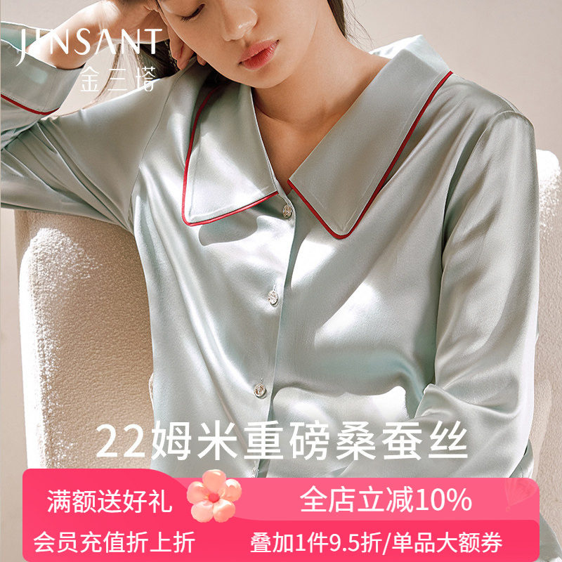 金三塔真丝睡衣女夏长袖套装两件套100%桑蚕丝春秋简约分体家居服