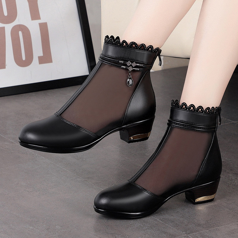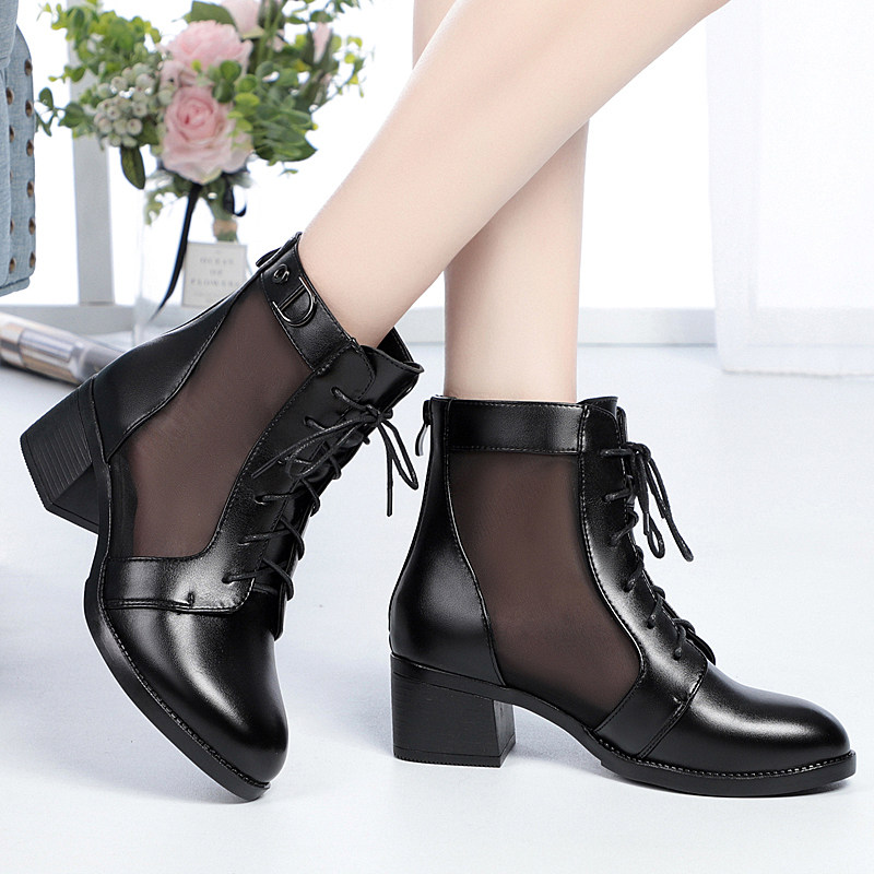 新款粗跟短靴女真皮中跟网纱靴镂空女靴夏季单靴透气凉靴春秋女鞋