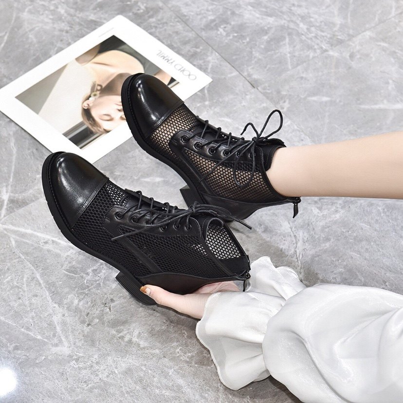 2025新款女靴中跟真皮网纱靴高跟靴子粗跟短靴女镂空网鞋春秋单靴