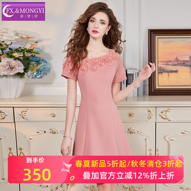 菲梦伊原创立体花朵连衣裙女短袖夏季设计感名媛收腰气质A字裙子