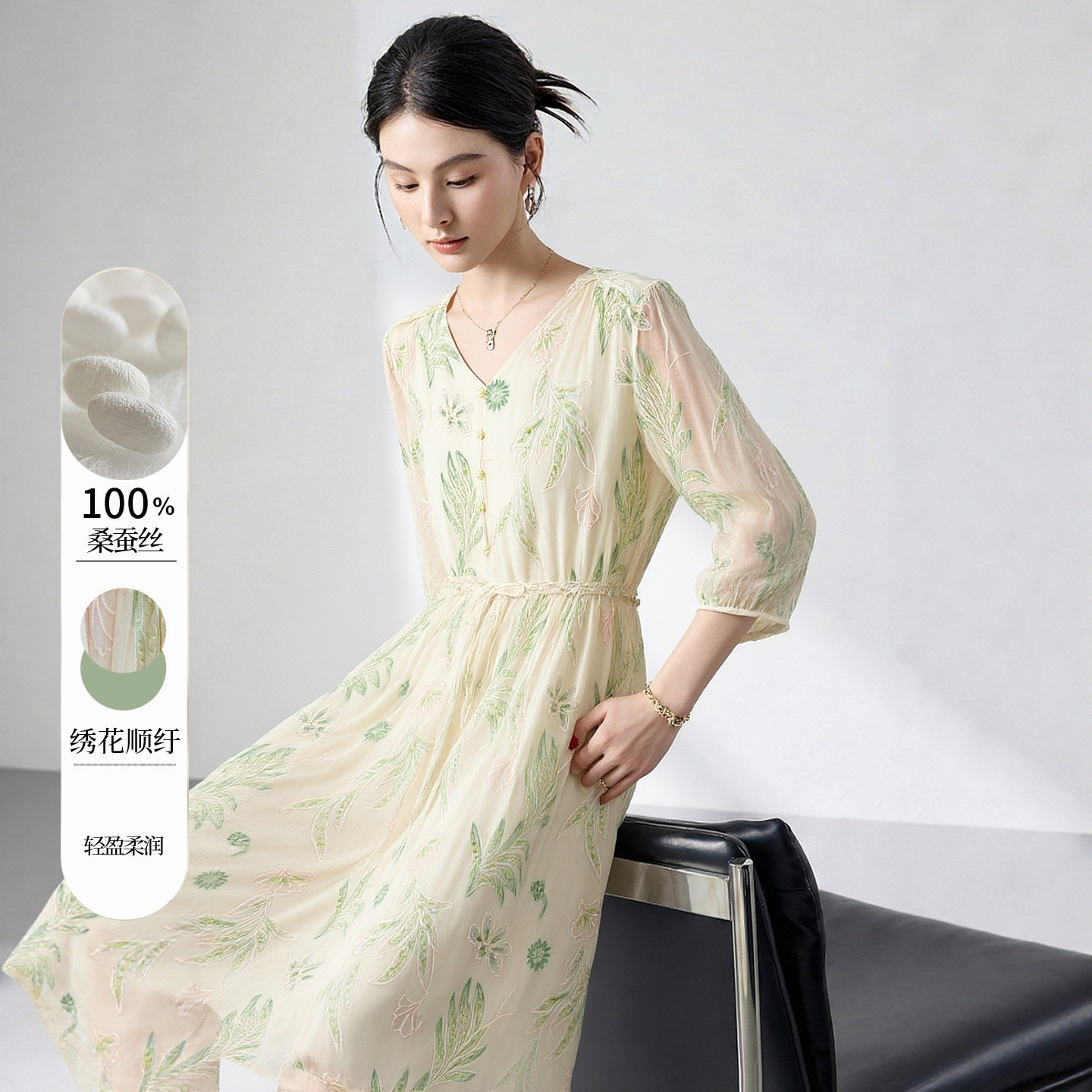 2026夏季新款桑蚕丝刺绣连衣裙女高腰显瘦A字中长裙气质名媛裙子