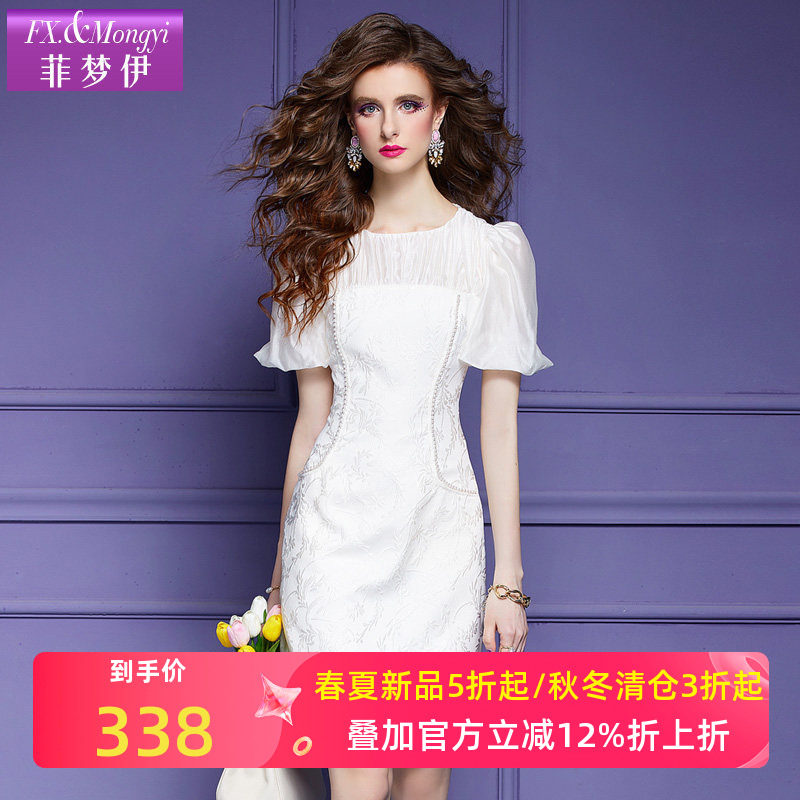 菲梦伊新中式连衣裙女夏季名媛气质显瘦钉珠天丝拼接白色A字裙子