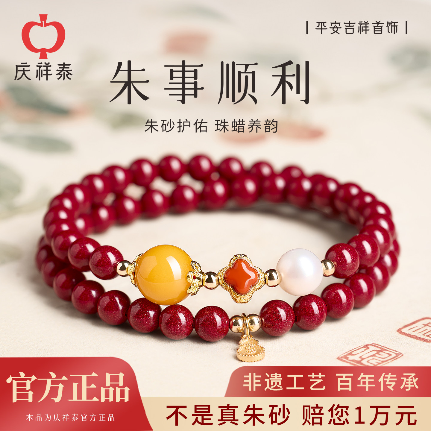 庆祥泰朱砂手串女本命年礼物三八节妇女送女友妈妈双圈四叶草手链