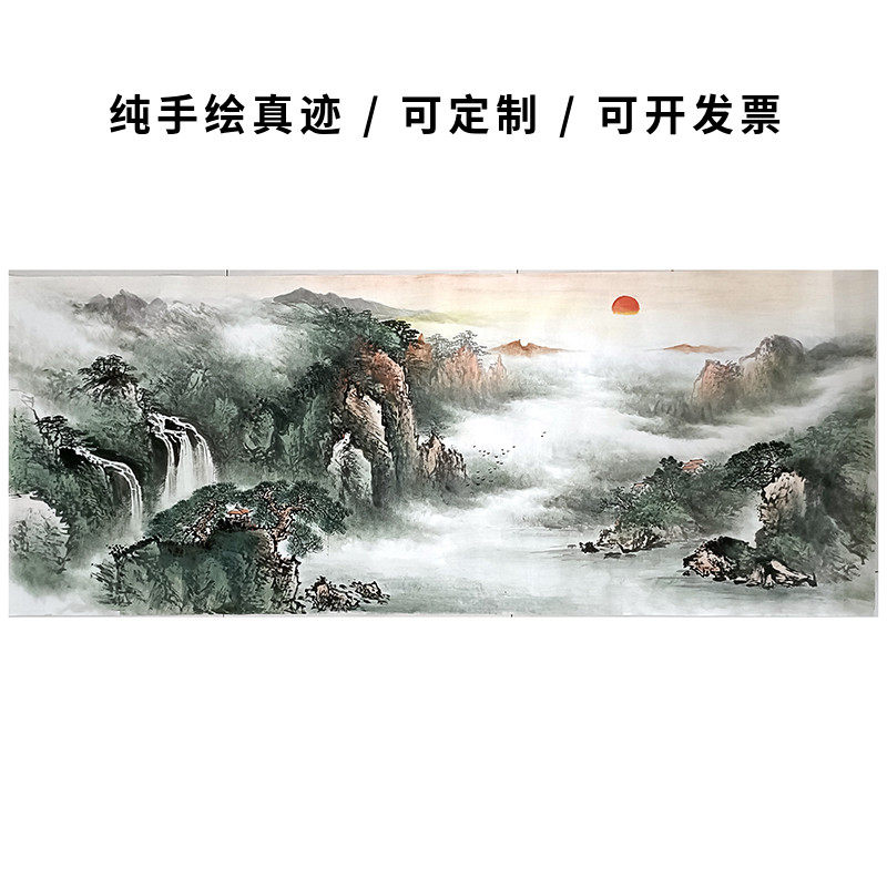 横幅招财山水画旭日东升风水挂画定制大尺寸卷轴画茶楼办公室挂画