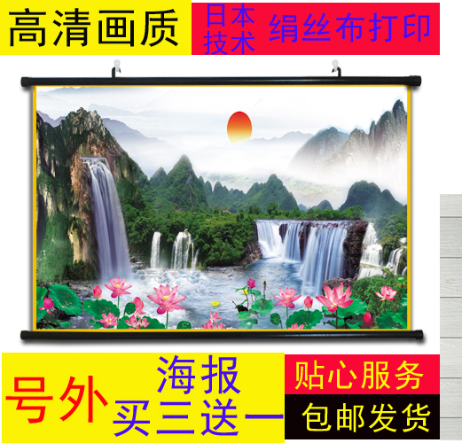 客厅山水画旭日东升海报风水靠山图流水生财大瀑布装饰画墙贴壁画