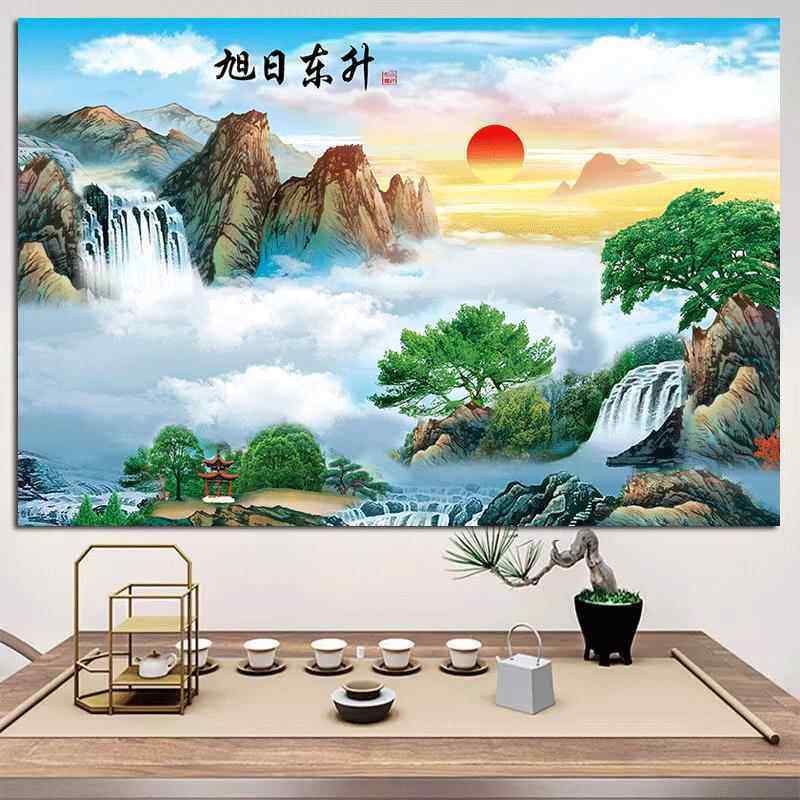旭日东升青山绿水山水画流水生财客厅办公室财源滚滚招财风水自粘
