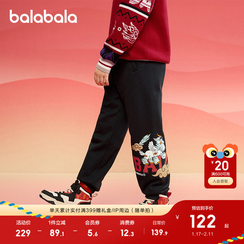 巴拉巴拉童装男童裤子儿童加绒长裤2026春秋装大童红色拜年服卫裤